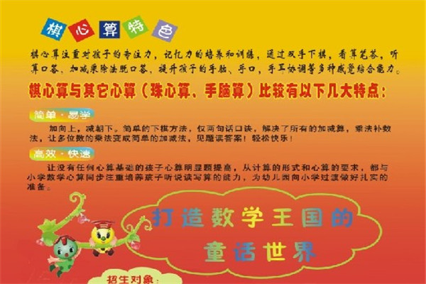 以上是對棋心算加盟優勢及其他相關知識的介紹,相信你看了以上的知識也已經了解了,棋心算可以讓孩子頭腦變得更加的靈活,使孩子變得更加聰明。所以加盟投資棋心算教育真的是一個非常不錯的選擇,有興趣的可以去加盟啦,不要在猶豫啦。