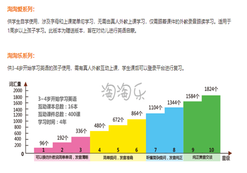 淘淘獅在美國加州幼兒及青少年英語習研究團隊提供的強力支持下,深入研究幼兒學習行為及發展規律,結合淘淘獅獨有記憶曲線,編寫出最適合孩子的、根據不同年齡幼兒認知能力而差別化設計的專業教材,充分滿足了不同年齡、不同英語學習階段寶寶的學習需求,配之以大量的互動環節,讓遠程學習從此不再乏味。傳統培訓學校最先開始學水果如apple,而淘淘獅根據幼兒認知規律,最先開始學baby,讓孩子認識世界從認識自己開始。