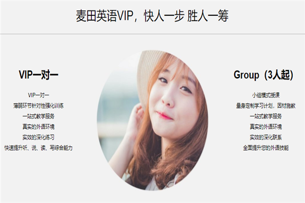 針對性的為您量身定制專屬于您的個人課程,外教一對一,量身定制,個性化教學,一站式服務,充分發揮出您的語言優勢,從0基礎到高分突破,麥田助您快速攻破外語大關,就是快人一步。這是專屬于您的外VIP,快速提升您的聽、說、讀、寫綜合能力助您海外留學直達世界名校勝人一籌。