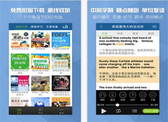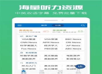 英文廣播、影視歌曲、口語發音、新概念英語音視頻同步雙語字幕,超過30萬篇有聲資源。