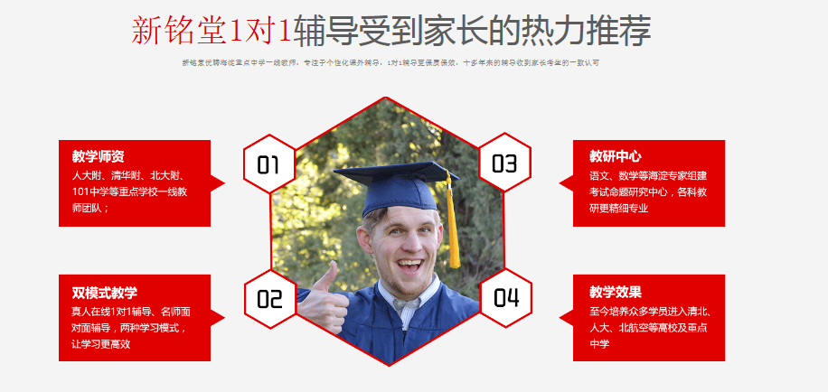 新銘堂教育一對(duì)一輔導(dǎo)專業(yè)教師集中在北京海淀,名師名校多,使得海淀教育水平高,海淀成為北京考試的中心,更是初高中教育的重要風(fēng)向。